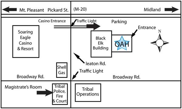 The entrance to the Office of Administrative Hearings (OAH) is located at the north side of the Black Elk Building, located on the east Side of Leaton Rd. just south of Pickard St. (M-20) and directly across from the Soaring Eagle Casino and Resort main entrance.