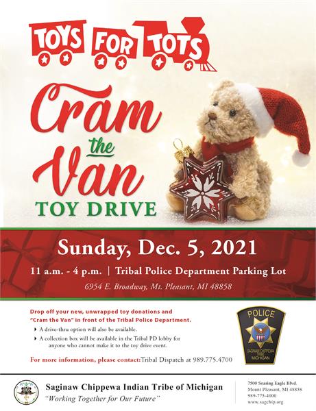 Please join our Tribal Police Department in supporting Toys For Tots on Sunday, December 5, 2021 from 11 am – 4 pm. Be a part of making a child’s holiday brighter! For more information please contact Tribal Dispatch at (989) 775-4700.