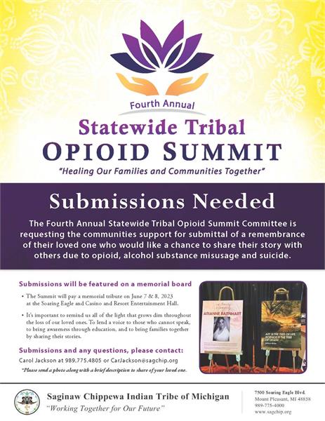 The Fourth Annual Statewide Tribal Opioid Summit Committee is requesting the communities support for submittal of a remembrance of their loved one who would like a chance to share their story with others due to opioid, alcohol substance misusage and suicide.