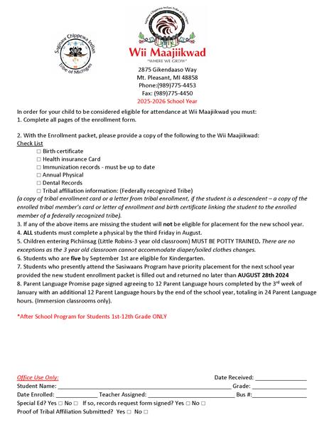 Wii Maajiikwad Immersion has three Immersion Classrooms for 2, 3, and 4 years olds. Enrolling a child in Wii Maajiikwad is a conscious choice for your child to learn Anishinaabe Language. There are require-ments for parental/caregiver language learning also. Only complete applications will be accepted.