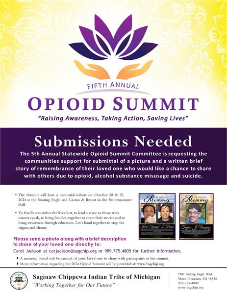 The 5th Annual Statewide Opioid Summit Committee is requesting the communities support for submittal of a picture and a written brief story of remembrance of their loved one who would like a chance to share with others due to opioid, alcohol substance misusage and suicide.