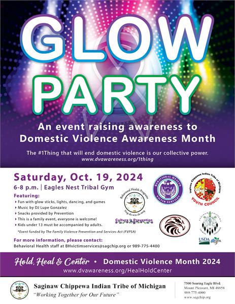 October is Domestic Violence Awareness Month! Behavioral Health’s Victim Services would like to bring awareness to the community with a few fun events. Please see attached flyers for Yoga that is being offered on two nights this month at Behavioral Health, 2800 S. Shepherd Rd. Mt. Pleasant, MI, on Tuesday, October 8th and 22nd from 5:30 -6:30 pm, registration is preferred for this event. As well as a Glow Party for the whole family, at Eagles Nest Tribal Gym on Saturday, October 19, 2024 from 6-8pm. Featuring fun with glow sticks, lights, dancing, games, DJ Lupe Gonzalez, and snacks. If you would like more information please contact us at BHvictimservices@sagchip.org or 989-775-4400. Hope to see you then!!