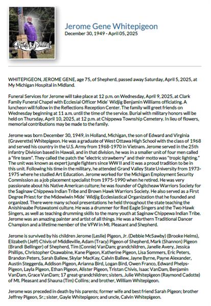 The family of Jerome Gene Whitepigeon, Sr. has notified the Tribal Clerks Office of his passing on April 5, 2025. Funeral arrangements are being handled by Clark Funeral Chapel in Mt Pleasant, MI. Date and time of services are still pending. Jerome was a Veteran.
