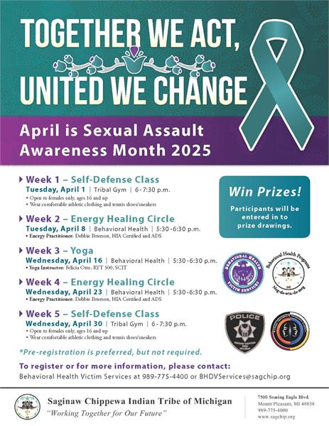If you haven’t already registered, there is still time. To register or for more information, please contact: Behavioral Health Victim Services: 989.775.4400 or BHDVServices@sagchip.org. Pre-Registration is preferred, but not required.