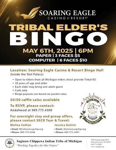 Please join us for Tribal Elders Bingo on Tuesday, May 6, 2025 at SECR Bingo Hall, beginning at 6 pm! This is open to elders 50 years of age and older from ALL Michigan Tribes.