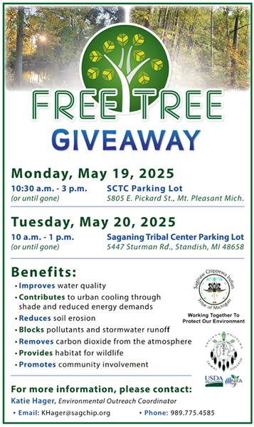 The Planning department’s Environmental team and the Saginaw Chippewa Tribal College are hosting a Free Tree Giveaway starting at 10:30 am (until trees are gone) in the Saginaw Chippewa Tribal College’s Parking Lot (5805 E. Pickard St. Mt. Pleasant, MI).