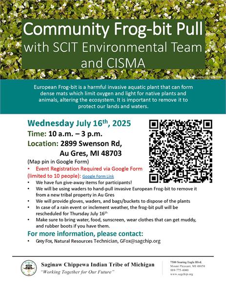 In case of a rain event or inclement weather, the frog-bit pull will be rescheduled for Thursday July 17th