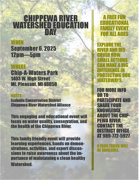 Join Isabella Conservation District and the Chippewa River Watershed Alliance for Watershed Education Day next Saturday, September 6th from 12 pm to 5 pm at Chipp-A-Waters Park (1403 W. High St.)!