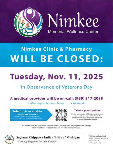 Nimkee will be closed on Tuesday, Nov. 11, 2025 In Observance of Veterans DayA medical provider will be on-call: (989) 317-2088