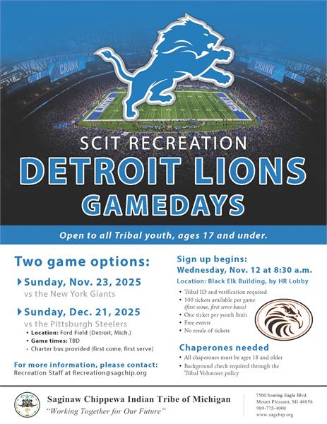 Attention Tribal Youth!! Through our amazing partnership with the Detroit Lions, The Saginaw Chippewa Indian Tribe Recreation Department is able to host 2 trips to a Detroit Lions Game. A special Miigwech goes out to Soaring Eagle Casino Resort and Tribal Council for getting these tickets for the community youth. Please spread the word! The first sign up day will be this Wednesday 11/12 beginning at 8:30am. If you are interested in chaperoning please sign up on the 12th also. Tickets will be available until they are gone. This is for SCIT Tribal Youth only. We will need adult chaperones to help supervise groups of youth.