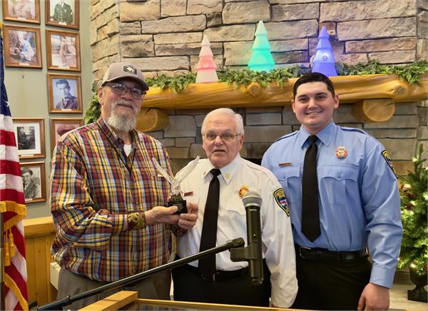 On Nov. 25, SCIT Tribal Chief Tim Davis receives a crystal eagle award on behalf of Council from Pinconning Fraser Fire Chief Dave Ramsey and his son, Fire Fighter Peyton Ramsey at the Saganing Outreach Center.