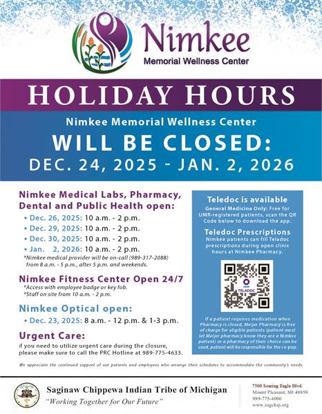 *Nimkee medical provider will be on-call (989-317-2088) from 8 a.m. - 5 p.m., after 5 p.m. and weekends.