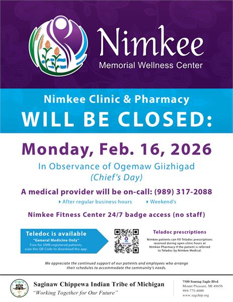 Nimkee will be closed Monday February 16th 2026 in observance of Ogemaw Giizhigad (Chiefs Day).