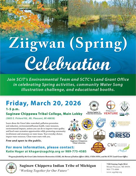 Partners: Environmental Team, Project Venture, SCTC LGO, ALRD, Saginaw Chippewa Tribal Libraries , City of Mount Pleasant Sustainability, Michigan Citizen’s for Water Conservation, American Indian Higher Education Consortium, Forest Hill Nature Area, Gratiot-Isabella RESD, Central Michigan University Sustainability, Chippewa Watershed Conservancy, Saginaw River Bay AOC, and Intertribal Council of Michigan.