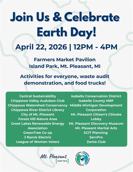 You are invited to join the City of Mt. Pleasant at their Earth Day Celebration held Wednesday, April 22nd from 12:00 to 4:00 pm at the Island Park Farmers Market Pavilion!