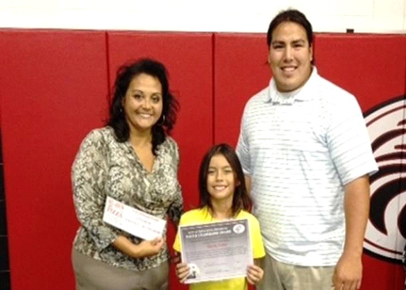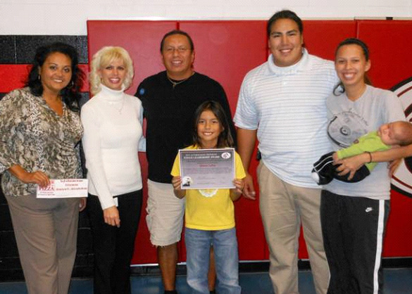 On Oct. 15th, SCIT Afterschool Program student Adam Saboo received the Eagle Leadership Award honor from Tribal Council Treasurer Louanna Bruner. Bruner commended the afterschool youth on their commitment in wanting to aspire to leadership roles in the Tribe. She stressed the importance of getting a good education and appreciates the parent's support of the afterschool program. Bruner was joined by Adam's proud parents (SCA Teacher assistance Kim Magoon and Scott Saboo) and his sister Rosemary Saboo and his little nephew Michael Biidwewdam (Strong Voice) Ekdahl and his father, SWCIT Parks & Recreation Director Ronnie Ekdahl.