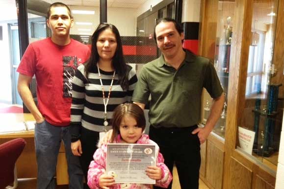 On March 4, SCIT Afterschool Program student Kasina Laughlin received her very first Eagle Leadership Award. Assistant Tribal Administrator Tonia Leaureaux presented the honor and Kasina was very happy she had finally received the award. Her mother, Nimkee Admin. Assistant Karen Naganashe, stated that, "Kasina has been trying very hard to receive this award." Kasina's mom and dad (Nimkee Maintenance employee Chris Laughlin) are very proud to hear of her outstanding behavior. "Kasina has shown wonderful leadership during the afterschool program by following the rules without question and setting a good example to the other children by participating in all activities with a positive attitude," Afterschool Team Staffer Betsey Alonzo explains. " I am very proud of Kasina, she really enjoys the program and her good behavior shows it. She is happy to arrive to the program and enjoys all we have to offer and it is a pleasure to have her here. (Pictured left to right: Afterschool Team Staffer Luke Sprague, Assistant Tribal Administrator Tonia Leaureaux, Kasina and Chris Laughlin).