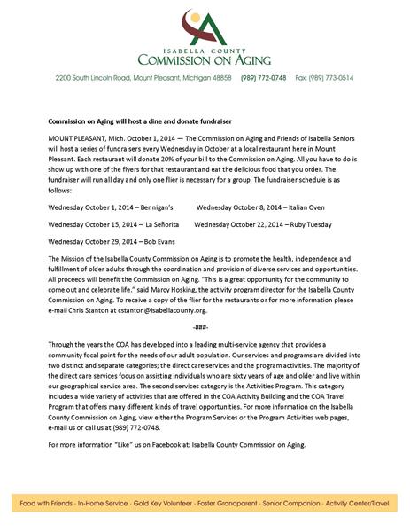 The Commission on Aging and Friends of Isabella Seniors will host a series of fundraisers every Wednesday in October at a local restaurant here in Mount Pleasant. Each restaurant will donate 20% of your bill to the Commission on Aging. All you have to do is show up with the attached flyer for that restaurant and eat the delicious food that you order.
