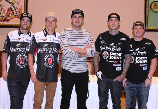 Tribal moto rider Lucas Sprague shares a moment with the RHC Soaring Eagle Team (L-R Broc Tickle, Ken Rozcen, Carey Hart and Ricky Carmichael).