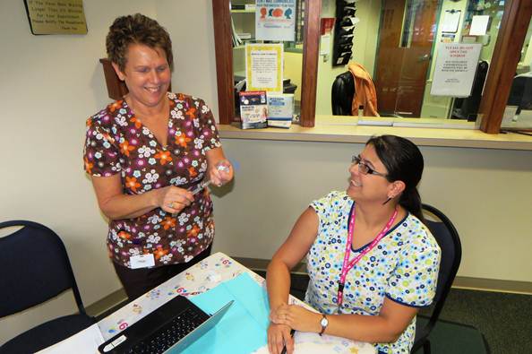 In an effort to provide bonus coverage, Team Observer joins with the Nimkee Memorial Wellness Center and the Nimkee Public Health Department as they provide their Walk-in Immunization Flu Clinic today from 8am to 8pm in the Nimkee lobby. Public Health Nurses Twila and Sue will be administering the free vaccine to all Tribal members and employees who come into the clinic. Medical Assistant Nicole Aasved shows how easy it is to take the brief three minute procedure. “I’ve been getting shots for years from Twila and I never feel a thing,” Aasved said.