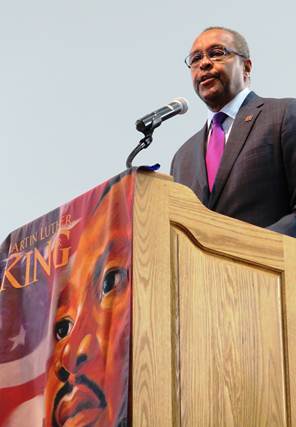 In an effort to provide bonus coverage, the CMU Campus and the Mount Pleasant Community came together on January 18 at Finch Fieldhouse celebrate and honor the rich legacy of Dr. Martin Luther King, Jr. CMU President Dr. George Ross gave opening remarks at the Dr. Martin Luther King, Jr. CommUNITY Peace Brunch with Tribal Observer, Joseph Sowmick, CMU Office for Institutional Diversity, Associate Vice President Dr. Carolyn Dunn, University Communications, Vice President Sherry Knight, Multicultural Academic Student Services, Executive Director Dr. Traci Guinn-Buckley, Native American Programs, Director Colleen Green and Niijkewehn Mentoring Coordinator Nicole McLachlan in attendance.