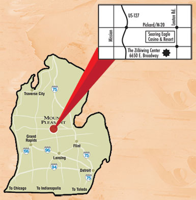Ziibiwing Center of Anishinabe Culture & Lifeways6650 E. BroadwayMt. Pleasant, MI 48858 Phone/FaxPhone: 989-775-4750Toll Free: 1-800-225-8172 Ext. 1-54750 Fax: 989-775-4770 Exhibits & Gift ShopMonday thru Friday • 9:00am - 4:30pmBusiness OfficeMonday thru Friday • 8am - 5pmResearch CenterMonday thru Friday • 9:00am - 4:30pmCall for appointment |